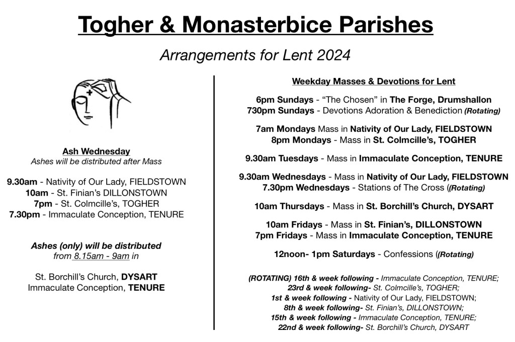 - Mondays 7am in The Nativity of Our Lady, Fieldstown and 8pm in St. Colmcille’s Togher