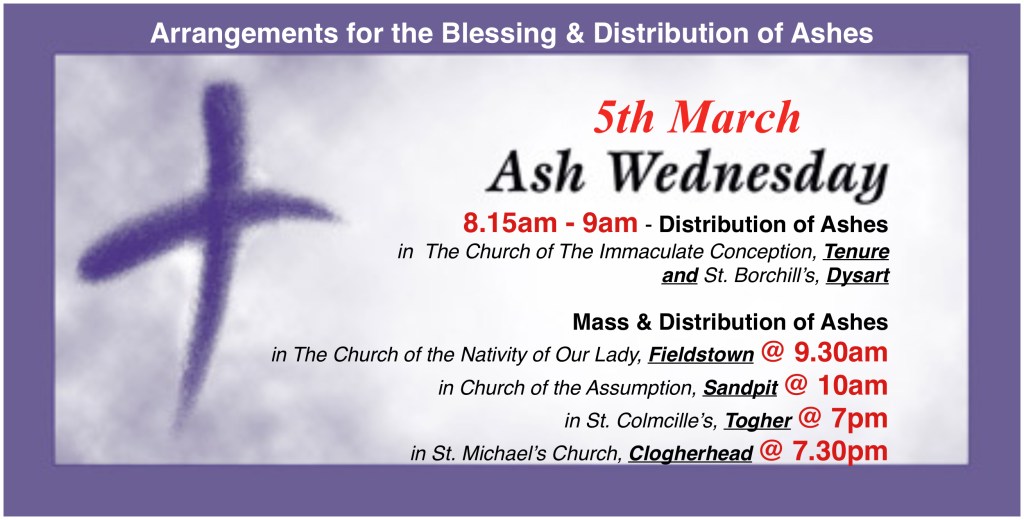 These are the times of Masses for Ash Wednesday in the St. Colmcille’s Pastoral Area;